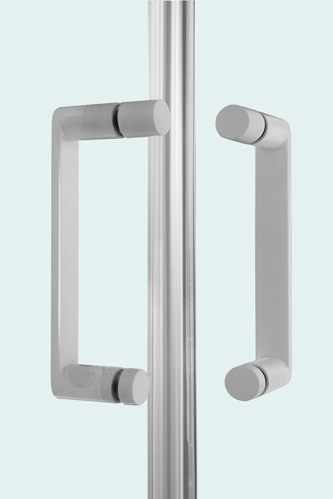 • Vetro temprato di sicurezza, trasparente a spessore 6mm • Profili in lega di alluminio, finitura lucida • Maniglie in metallo, finitura cromata • Ruote a doppio carrello • Guarnizioni magnetiche di tenuta • Compensazione per parete fuori squadra