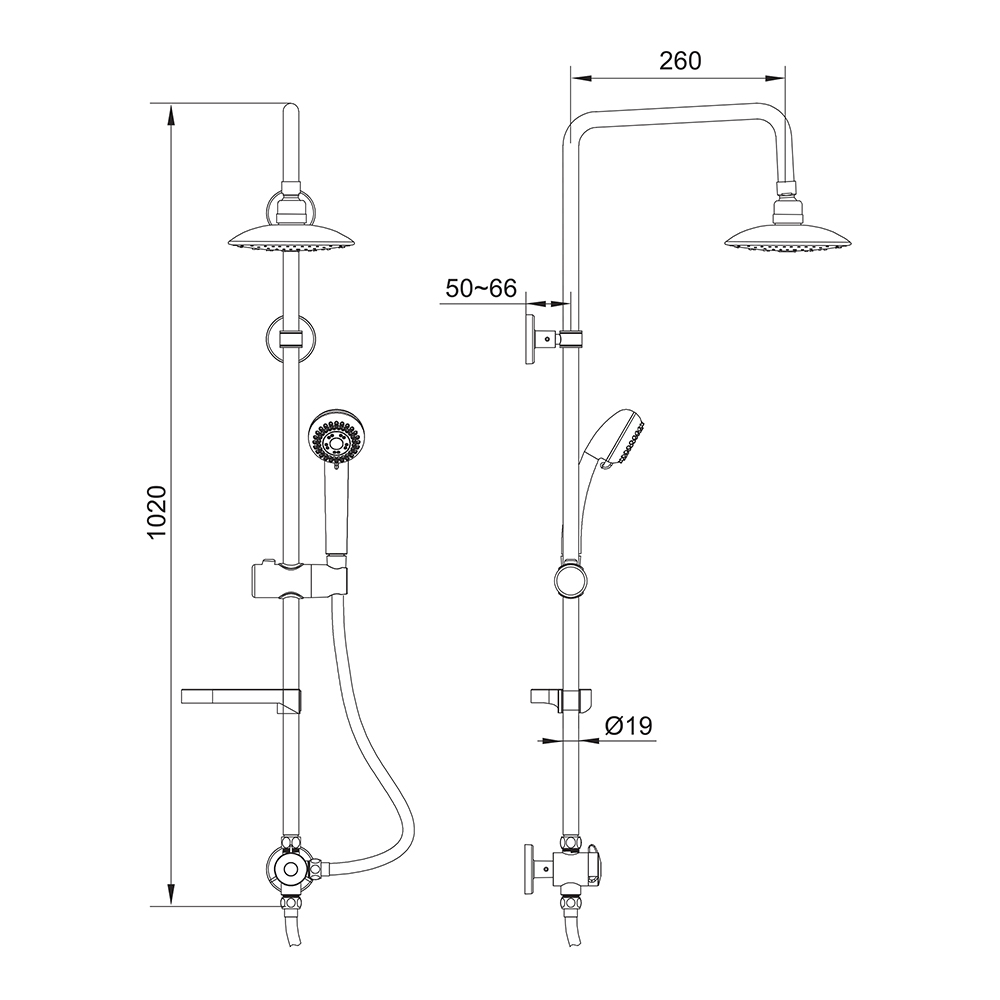 Colonna doccia 1020×260 mm composta da: soffione tondo monogetto Diam. 160 mm anticalcare in ABS cromato. Doccetta 3 getti in ABS cromato, supporto doccetta; deviatore in plastica. Flessibile doccia lunghezza 1500 mm in acciaio inox. Con -portasapone in ABS cromato. Asta tonda scorrevole in acciaio inox con interasse regolabile.
