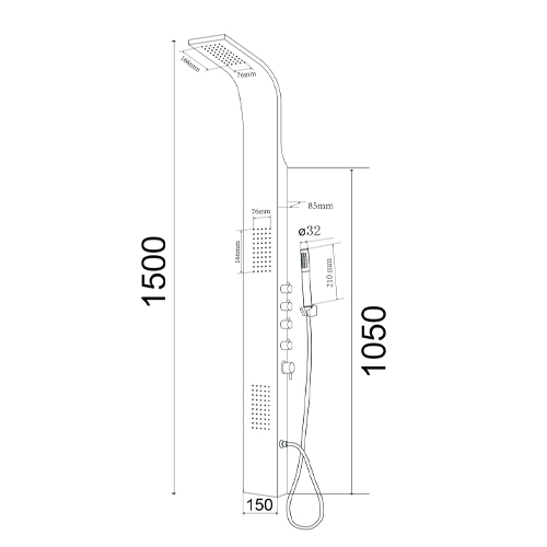 Realizzata in alluminio verniciato, 3 funzioni selezionabili: doccetta a mano, soffione, getto orizzontale. Completo di laccio doccia in acciaio inox. Dimensioni: cm L. 15 x H 150