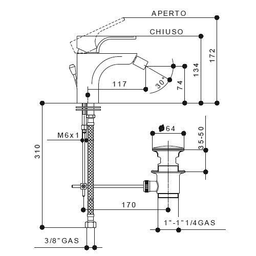 Miscelatore monocomando per bidet con scarico, erogazione a doccetta orientabile.