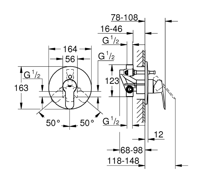 Montaggio a incasso composto da: parte esterna corpo incasso 33 963 000 leva in metallo cartuccia a dischi ceramici GROHE Long-Life da 46 mm dotato di serie di limitatore di portata regolabile deviatore automatico fissaggi nascosti disponibile limitatore di temperatura (da attivare) come accessorio cod. 46 308