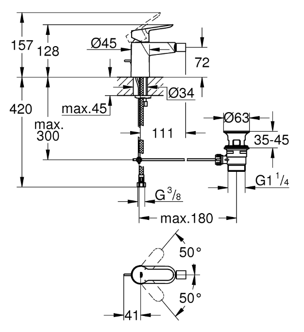 Leva in metallo cartuccia a dischi ceramici GROHE Long-Life da 28 mm con tecnologia GROHE Water Saving per il risparmio idrico portata massima (a 3 bar): 5 l/min rapido sistema di installazione con raccordo a sfera orientabile scarico a saltarello 1 1/4″