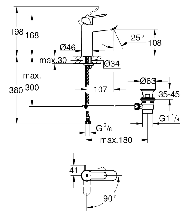 Leva in metallo cartuccia a dischi ceramici da 28 mm con tecnologia GROHE Long-Life ES per risparmio energetico con limitatore di temperatura integrato con tecnologia GROHE Water Saving per il risparmio idrico portata massima (a 3 bar): 5 l/min rapido sistema di installazione scarico a saltarello 1 1/4″