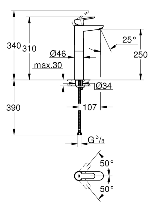 Per lavabi a pavimento free-standing leva in metallo cartuccia a dischi ceramici GROHE Long-Life da 28 mm con tecnologia GROHE Water Saving per il risparmio idrico portata massima (a 3 bar): 5 l/min senza scarico a saltarello