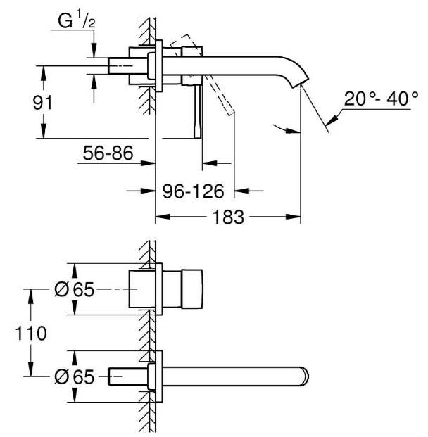 Installazione a parete parte esterna per corpo incasso 23 571 000 / 32 635 000 rosone metallico con tecnologia GROHE Water Saving per il risparmio idrico portata massima (a 3 bar): 5 l/min mousseur regolabile con tecnologia GROHE AquaGuide distanza dal centro 110 mm sporgenza 183 mm REFERENZA DEDICATA AL CANALE TRADIZIONALE Sostituisce cod. 19 408 XX1
