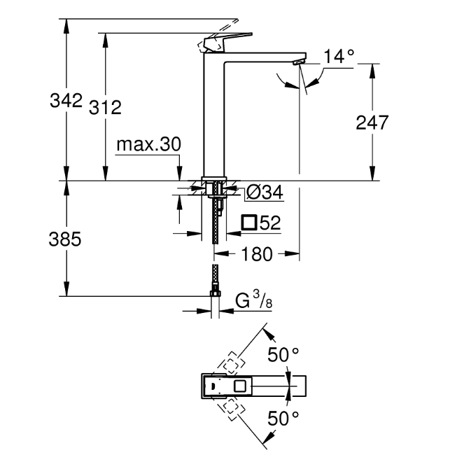 Per lavabi a pavimento free-standing cartuccia a dischi ceramici da 28 mm con tecnologia GROHE SilkMove dotato di serie di limitatore di temperatura con tecnologia GROHE Water Saving per il risparmio idrico portata massima (a 3 bar): 5 l/min sistema di installazione GROHE FastFixation Plus senza scarico a saltarello