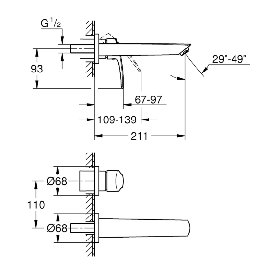 Installazione a parete leva in metallo parte esterna per corpo incasso 23 571 000 / 32 635 000 rosone metallico con tecnologia GROHE Water Saving per il risparmio idrico portata massima (a 3 bar): 5 l/min mousseur regolabile con tecnologia GROHE AquaGuide distanza dal centro 110 mm sporgenza bocca 211 mm REFERENZA DEDICATA AL CANALE TRADIZIONALE