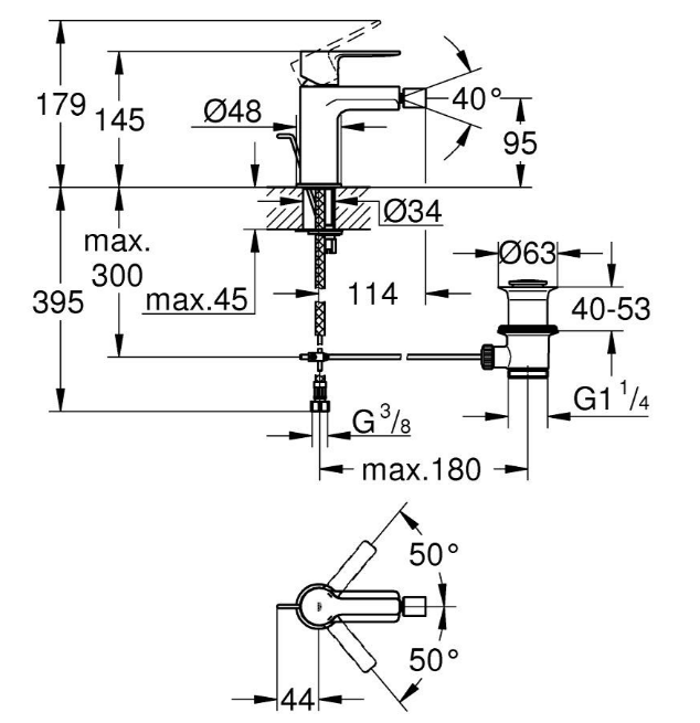 Cartuccia a dischi ceramici da 28 mm con tecnologia GROHE SilkMove dotato di serie di limitatore di temperatura con tecnologia GROHE Water Saving per il risparmio idrico portata massima (a 3 bar): 5 l/min sistema di installazione GROHE FastFixation Plus mousseur orientabile scarico a saltarello 1 1/4″