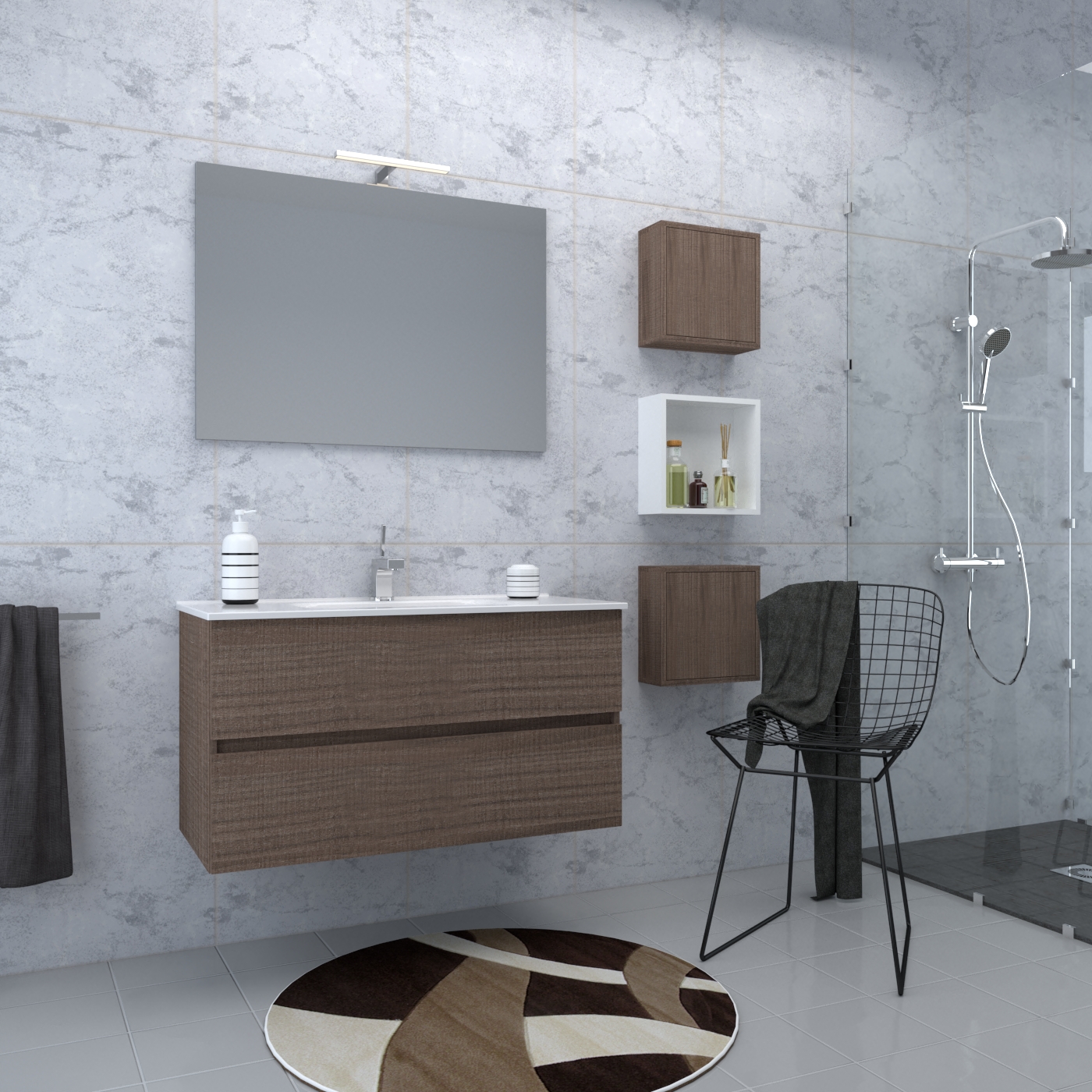 MOBILE CON LAVABO PER BAGNO SERIE ROX 100 CM. Questo mobile sospeso della larghezza di 100 centimetri e profondità 46, è dotato di ampi cassetti con chiusura rallentata, la tecnologia soft close eviterà i fastidiosi rumori provocati da chiusure improvvise. La finitura del mobile permette il facile abbinamento ad un bagno moderno ed elegante. LA COMPOSIZIONE INCLUDE: la base, il lavabo e lo specchio con lampada DIMENSIONI: Base: L. cm 99 P. cm 44 H. cm 54 Lavabo: L. cm 101 P. cm 46 H. cm 2 Specchio: L. cm 95 SP. cm 2 H. cm 68 NON SONO INCLUSI: il rubinetto e il sifone acquistabili separatamente MATERIALI: STRUTTURA E SCOCCHE: pannello nobilitato con finitura NOCE, Bordatura in abs da 1 mm, utilizzo di colle speciali che aumentano la resistenza del pannello all’umidità. FERRAMENTA: i cassetti hanno il sistema di chiusura ammortizzata per una maggiore qualità e comfort. SPECCHIO: specchio filo lucido. Senza presa e interruttore. LAVABO: In ceramica di prima qualità LAMPADA: Lampada Led 5W ABS CROMO FISSAGGIO: tasselli e placche per il fissaggio inclusi