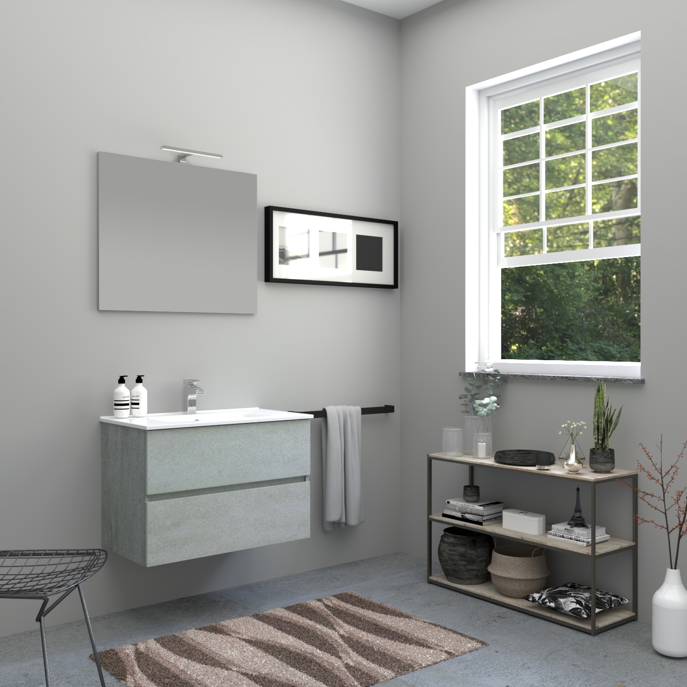 MOBILE CON LAVABO PER BAGNO SERIE ROX 75 CM. Questo mobile sospeso della larghezza di 75 centimetri e profondità 46, è dotato di ampi cassetti con chiusura rallentata, la tecnologia soft close eviterà i fastidiosi rumori provocati da chiusure improvvise. La finitura del mobile permette il facile abbinamento ad un bagno moderno ed elegante. LA COMPOSIZIONE INCLUDE: la base, il lavabo e lo specchio con lampada DIMENSIONI: Base: L. cm 74 P. cm 44 H. cm 54 Lavabo: L. cm 76 P. cm 46 H. cm 2 Specchio: L. cm 70 SP. cm 2 H. cm 68 NON SONO INCLUSI: il rubinetto e il sifone acquistabili separatamente STRUTTURA E SCOCCHE: pannello nobilitato con finitura CEMENTO, Bordatura in abs da 1 mm, utilizzo di colle speciali che aumentano la resistenza del pannello all’umidità. FERRAMENTA: i cassetti hanno il sistema di chiusura ammortizzata per una maggiore qualità e comfort. SPECCHIO: specchio filo lucido. Senza presa e interruttore. LAVABO: In ceramica di prima qualità LAMPADA: Lampada Led 5W ABS CROMO FISSAGGIO: tasselli e placche per il fissaggio inclusi