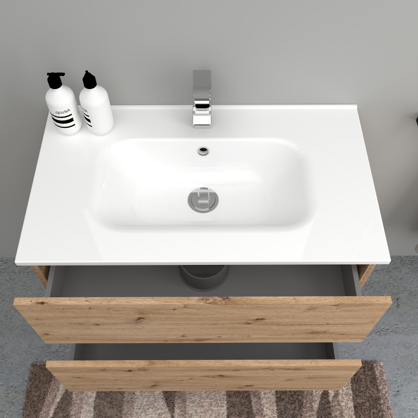 MOBILE CON LAVABO PER BAGNO SERIE ROX 75 CM. Questo mobile sospeso della larghezza di 75 centimetri e profondità 46, è dotato di ampi cassetti con chiusura rallentata, la tecnologia soft close eviterà i fastidiosi rumori provocati da chiusure improvvise. La finitura del mobile permette il facile abbinamento ad un bagno moderno ed elegante. LA COMPOSIZIONE INCLUDE: la base, il lavabo e lo specchio con lampada DIMENSIONI: Base: L. cm 74 P. cm 44 H. cm 54 Lavabo: L. cm 76 P. cm 46 H. cm 2 Specchio: L. cm 70 SP. cm 2 H. cm 68 NON SONO INCLUSI: il rubinetto e il sifone acquistabili separatamente STRUTTURA E SCOCCHE: pannello nobilitato con finitura ROVERE NODATO, Bordatura in abs da 1 mm, utilizzo di colle speciali che aumentano la resistenza del pannello all’umidità. FERRAMENTA: i cassetti hanno il sistema di chiusura ammortizzata per una maggiore qualità e comfort. SPECCHIO: specchio filo lucido. Senza presa e interruttore. LAVABO: In ceramica di prima qualità LAMPADA: Lampada Led 5W ABS CROMO FISSAGGIO: tasselli e placche per il fissaggio inclusi