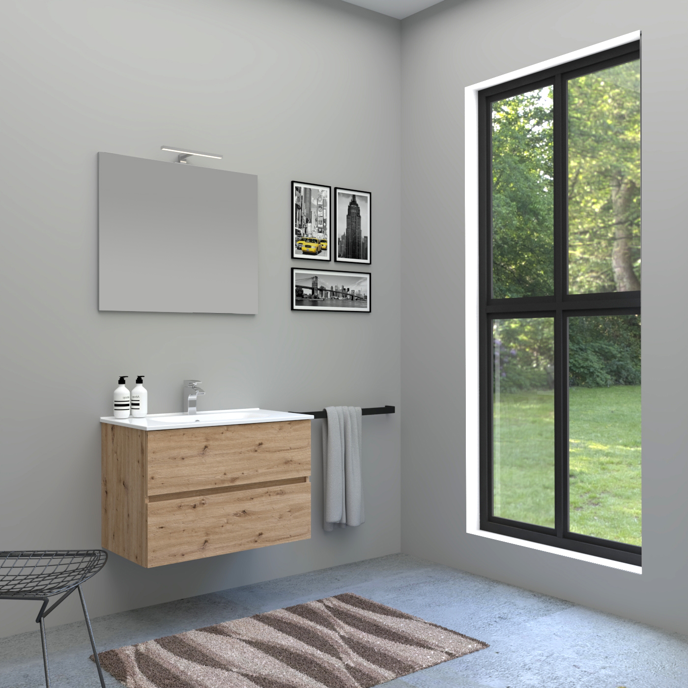 MOBILE CON LAVABO PER BAGNO SERIE ROX 80 CM. Questo mobile sospeso della larghezza di 80 centimetri e profondità 46, è dotato di ampi cassetti con chiusura rallentata, la tecnologia soft close eviterà i fastidiosi rumori provocati da chiusure improvvise. La finitura del mobile permette il facile abbinamento ad un bagno moderno ed elegante. LA COMPOSIZIONE INCLUDE: la base, il lavabo e lo specchio con lampada DIMENSIONI: Base: L. cm 79 P. cm 44 H. cm 54 Lavabo: L. cm 81 P. cm 46 H. cm 2 Specchio: L. cm 80 SP. cm 2 H. cm 68 NON SONO INCLUSI: il rubinetto e il sifone acquistabili separatamente STRUTTURA E SCOCCHE: pannello nobilitato con finitura ROVERE NODATO, Bordatura in abs da 1 mm, utilizzo di colle speciali che aumentano la resistenza del pannello all’umidità. FERRAMENTA: i cassetti hanno il sistema di chiusura ammortizzata per una maggiore qualità e comfort. SPECCHIO: specchio filo lucido. Senza presa e interruttore. LAVABO: In ceramica di prima qualità LAMPADA: Lampada Led 5W ABS CROMO FISSAGGIO: tasselli e placche per il fissaggio inclusi