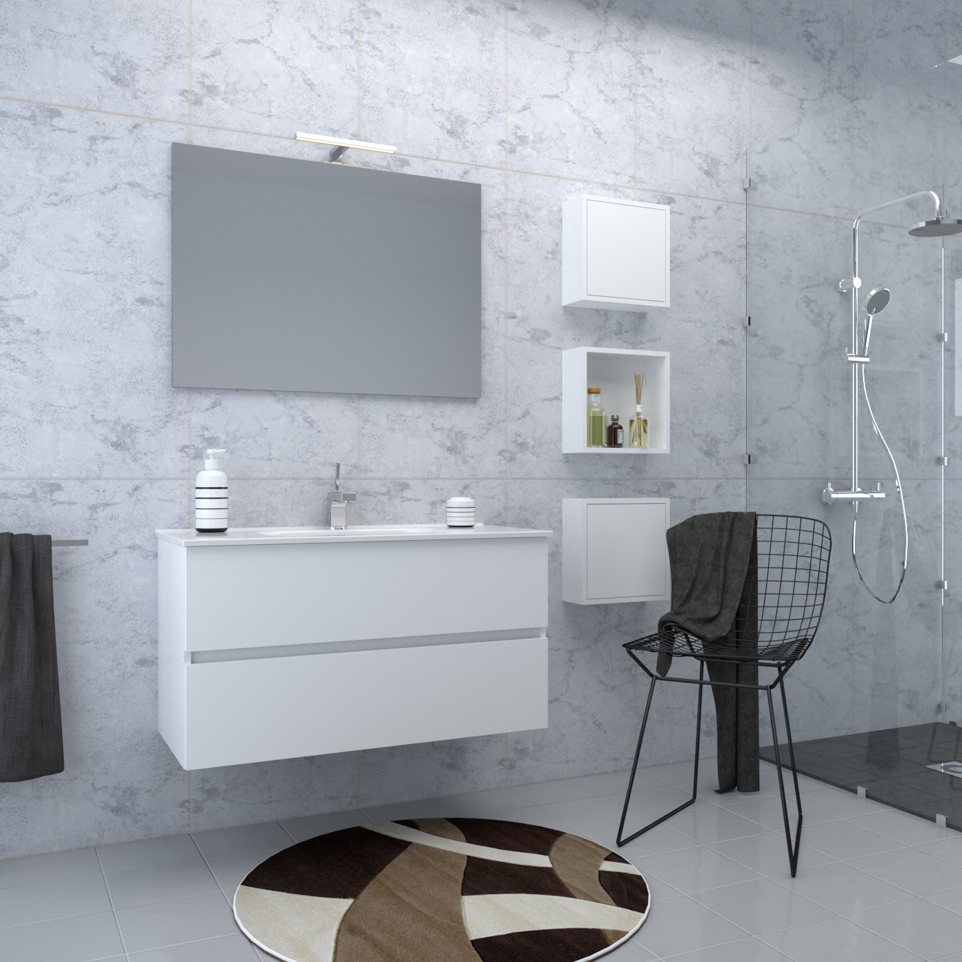 MOBILE CON LAVABO PER BAGNO SERIE ROX 90 CM. Questo mobile sospeso della larghezza di 90 centimetri e profondità 46, è dotato di ampi cassetti con chiusura rallentata, la tecnologia soft close eviterà i fastidiosi rumori provocati da chiusure improvvise. La finitura del mobile permette il facile abbinamento ad un bagno moderno ed elegante. LA COMPOSIZIONE INCLUDE: la base, il lavabo e lo specchio con lampada DIMENSIONI: Base: L. cm 89 P. cm 44 H. cm 54 Lavabo: L. cm 91 P. cm 46 H. cm 2 Specchio: L. cm 80 SP. cm 2 H. cm 68 NON SONO INCLUSI: il rubinetto e il sifone acquistabili separatamente STRUTTURA E SCOCCHE: pannello nobilitato con finitura BIANCO LUCIDO, Bordatura in abs da 1 mm, utilizzo di colle speciali che aumentano la resistenza del pannello all’umidità. FERRAMENTA: i cassetti hanno il sistema di chiusura ammortizzata per una maggiore qualità e comfort. SPECCHIO: specchio filo lucido. Senza presa e interruttore. LAVABO: In ceramica di prima qualità LAMPADA: Lampada Led 5W ABS CROMO FISSAGGIO: tasselli e placche per il fissaggio inclusi