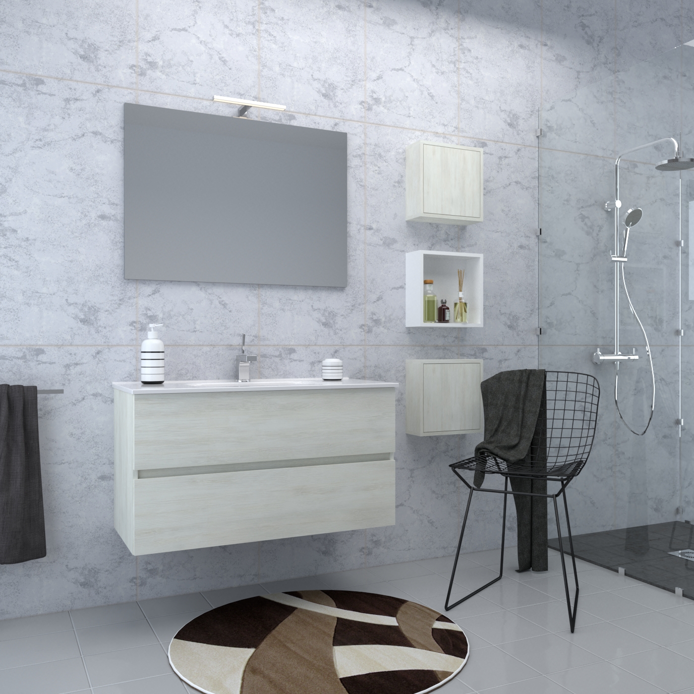 MOBILE CON LAVABO PER BAGNO SERIE ROX 90 CM. Questo mobile sospeso della larghezza di 90 centimetri e profondità 46, è dotato di ampi cassetti con chiusura rallentata, la tecnologia soft close eviterà i fastidiosi rumori provocati da chiusure improvvise. La finitura del mobile permette il facile abbinamento ad un bagno moderno ed elegante. LA COMPOSIZIONE INCLUDE: la base, il lavabo e lo specchio con lampada DIMENSIONI: Base: L. cm 89 P. cm 44 H. cm 54 Lavabo: L. cm 91 P. cm 46 H. cm 2 Specchio: L. cm 80 SP. cm 2 H. cm 68 NON SONO INCLUSI: il rubinetto e il sifone acquistabili separatamente STRUTTURA E SCOCCHE: pannello nobilitato con finitura BIANCO MATRIX, Bordatura in abs da 1 mm, utilizzo di colle speciali che aumentano la resistenza del pannello all’umidità. FERRAMENTA: i cassetti hanno il sistema di chiusura ammortizzata per una maggiore qualità e comfort. SPECCHIO: specchio filo lucido. Senza presa e interruttore. LAVABO: In ceramica di prima qualità LAMPADA: Lampada Led 5W ABS CROMO FISSAGGIO: tasselli e placche per il fissaggio inclusi