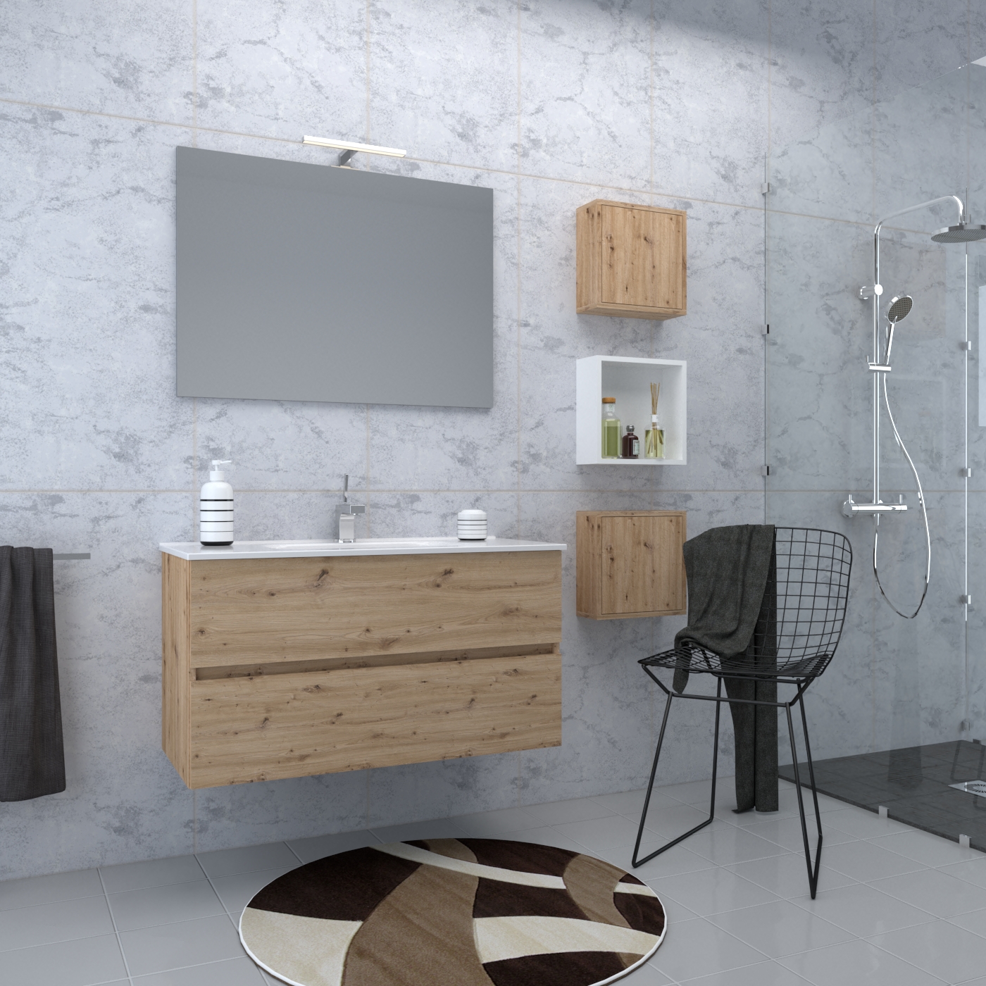 MOBILE CON LAVABO PER BAGNO SERIE ROX 90 CM. Questo mobile sospeso della larghezza di 90 centimetri e profondità 46, è dotato di ampi cassetti con chiusura rallentata, la tecnologia soft close eviterà i fastidiosi rumori provocati da chiusure improvvise. La finitura del mobile permette il facile abbinamento ad un bagno moderno ed elegante. LA COMPOSIZIONE INCLUDE: la base, il lavabo e lo specchio con lampada DIMENSIONI: Base: L. cm 89 P. cm 44 H. cm 54 Lavabo: L. cm 91 P. cm 46 H. cm 2 Specchio: L. cm 80 SP. cm 2 H. cm 68 NON SONO INCLUSI: il rubinetto e il sifone acquistabili separatamente STRUTTURA E SCOCCHE: pannello nobilitato con finitura ROVERE NODATO, Bordatura in abs da 1 mm, utilizzo di colle speciali che aumentano la resistenza del pannello all’umidità. FERRAMENTA: i cassetti hanno il sistema di chiusura ammortizzata per una maggiore qualità e comfort. SPECCHIO: specchio filo lucido. Senza presa e interruttore. LAVABO: In ceramica di prima qualità LAMPADA: Lampada Led 5W ABS CROMO FISSAGGIO: tasselli e placche per il fissaggio inclusi