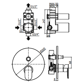 Miscelatore incasso doccia Piastra Ø 20cm Attacchi calda/fredda e superiore 1/2”G - attacco inferiore 3/4''G Con deviatore a pulsante (2 uscite) Finitura cromo