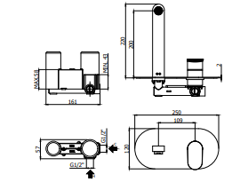 Miscelatore incasso lavabo Piastra in acciaio inox 250x120mm Attacchi 1/2”G Bocca di erogazione l. 20 cm Finitura cromo