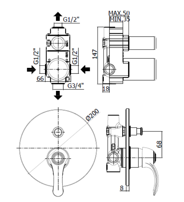 Il monocomando incasso doccia con deviatore della collezione Flavia di Paffoni è completo di:piastra tonda in metallo Ø200 mm; attacchi acqua calda/fredda 1/2”G; attacco superiore 1/2”G; attacco inferiore 3/4”G; 2 uscite; deviatore a pulsante Mix incasso doccia con deviatore della collezione Flavia, in ottone cromo