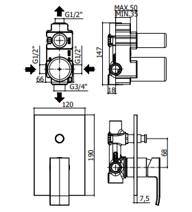 Piastra 110x110mm, Attacchi 1/2”G, Con deviatore (2 uscite), Finitura cromo
