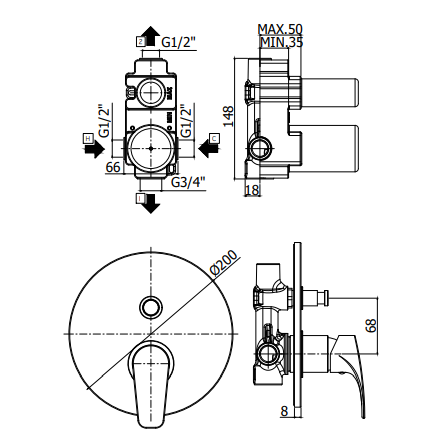 Miscelatore Monocomando Incasso Doccia con deviatore, serie Lime, di Rubinetteria Paffoni, con piastra in metallo di Ø200mm e attacchi calda/fredda e superiore da ½”G, attacco inferiore da ¾”G