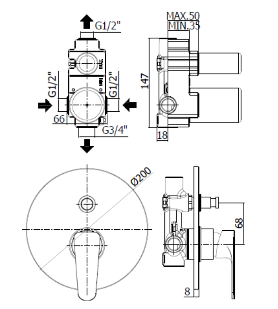 piastra in metallo Ø200 mm attacchi acqua calda/fredda 1/2”G attacco superiore 1/2”G attacco inferiore 3/4”G 2 uscite deviatore a pulsante