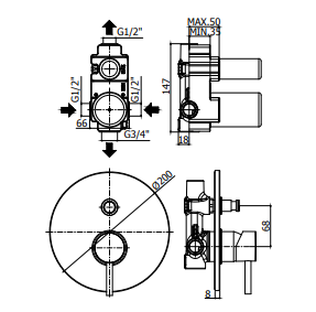 Miscelatore incasso doccia Piastra in metallo Ø200mm Attacchi calda/fredda e superiore 1/2''G - attacco inferiore 3/4''G Con deviatore a pulsante (2 uscite) Finitura cromo