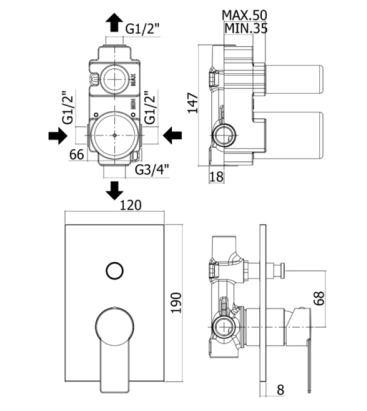 Il modello Tango firmato Paffoni (cod. TA015CR), in ottone cromato, a 2 uscite con deviatore a pulsante, fornito con: piastra 120×190 mm; attacchi calsa/fredda e superiore 1/2”G – attacco inferiore 3/4”G.