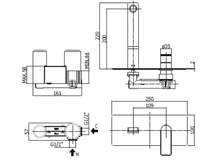 Miscelatore lavabo incasso a muro Tango di Paffoni, Finitura cromo. Design semplice, elegante e moderno. Dimensioni: mm L.161 x P.220 x H.100.