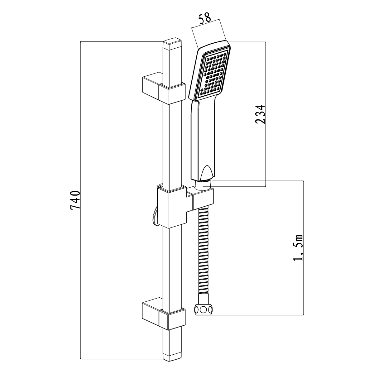 Saliscendi doccia composto da: doccetta monogetto diametro 58 mm con water saving. Laccio doccia lungh. 150 cm in acciaio inox. Supporto doccetta scorrevole. Altezza totale 76 cm. Finitura cromata. Asta con interasse regolabile.